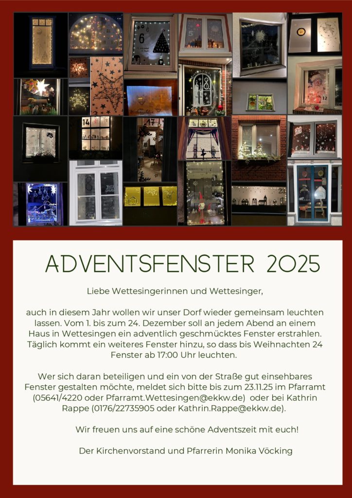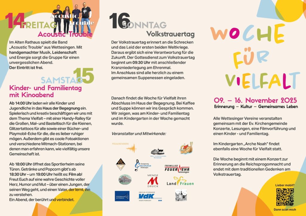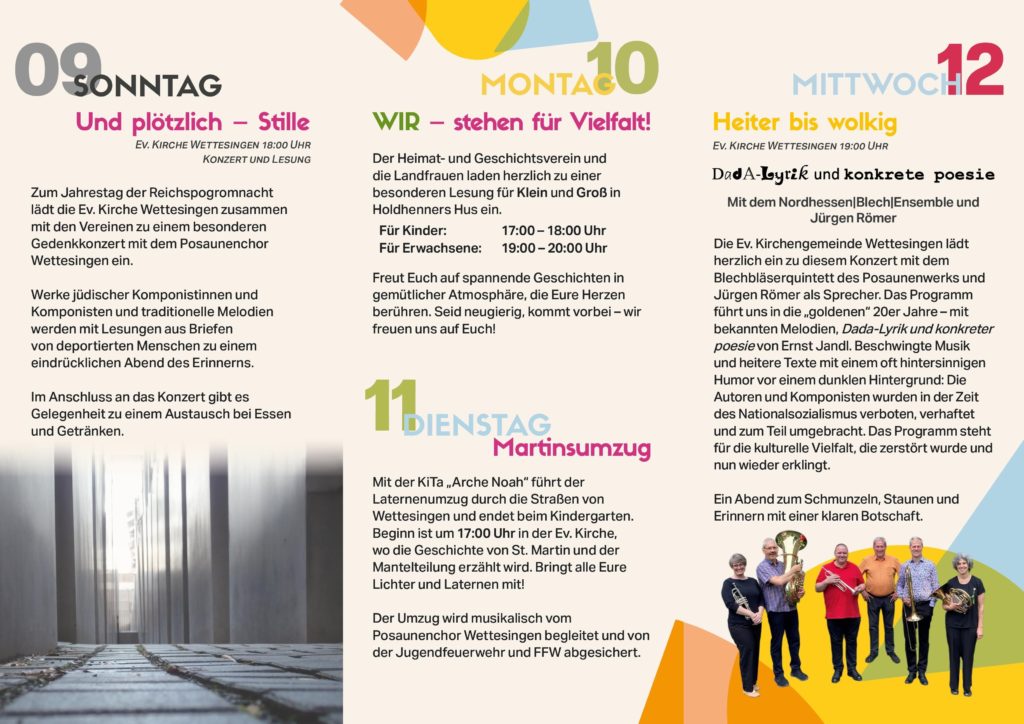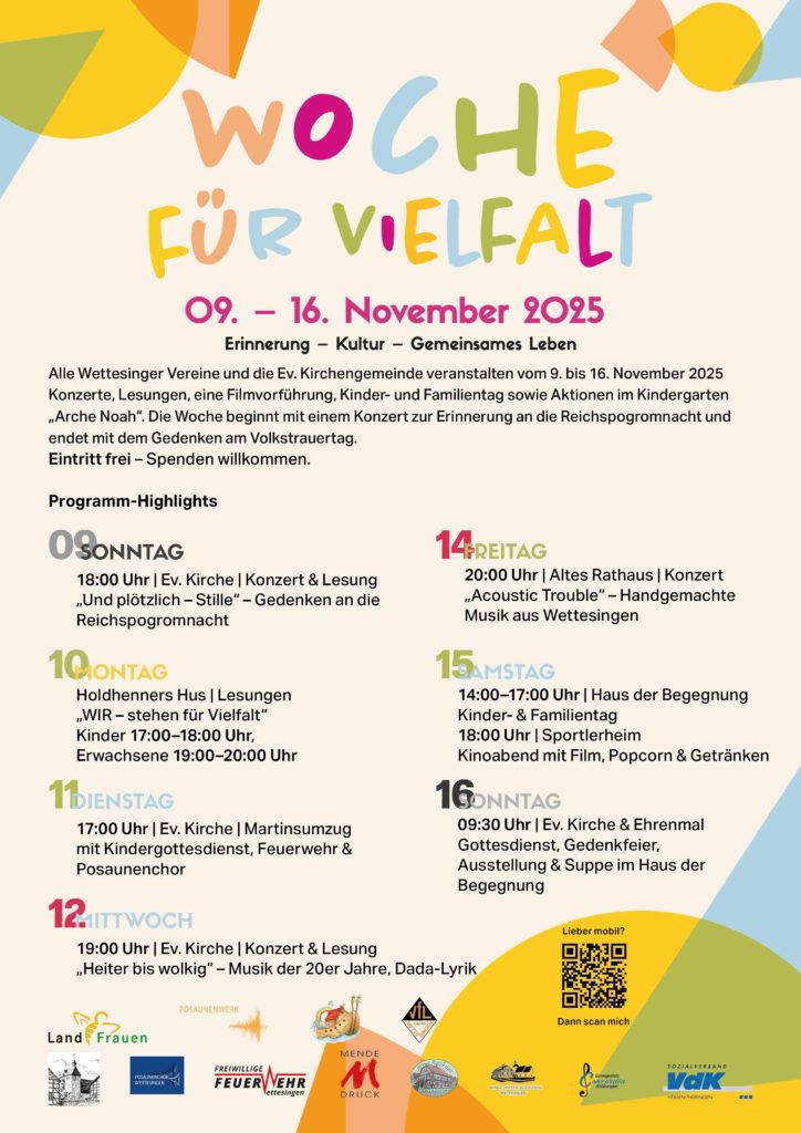 Alle Wettesinger Vereine veranstalten gemeinsam mit der Ev. Kirchengemeinde Konzerte, Lesungen, eine Filmvorführung und einen Kinder- und Familientag. Erleben Sie eine Woche voller Begegnungen, Kultur und Gemeinschaft.